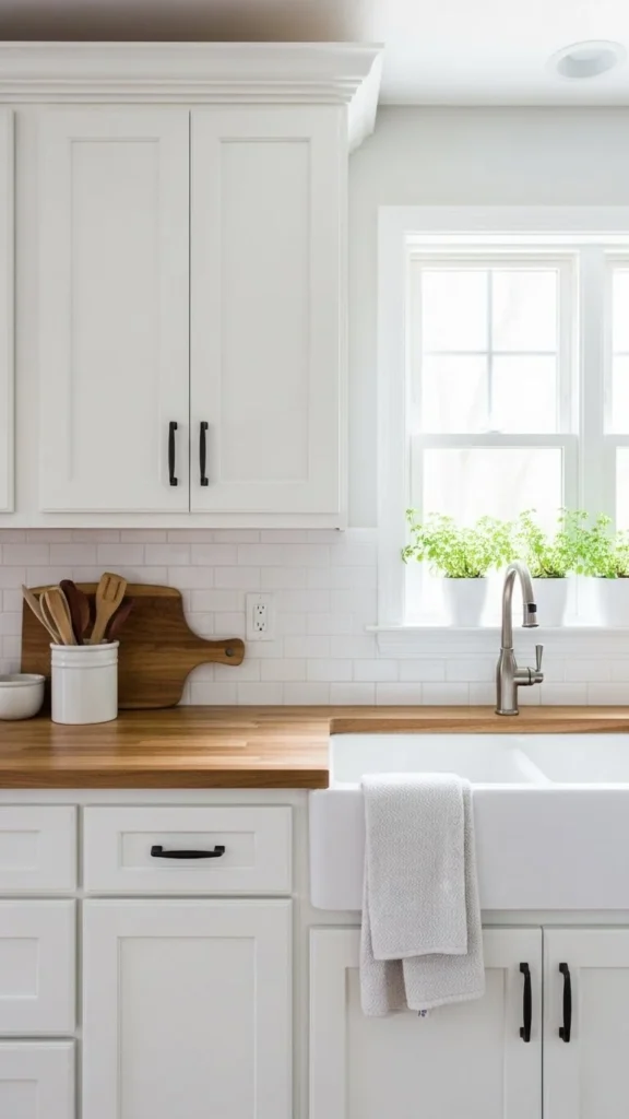 Use one small tray in the kitchen with three items: a small vase, a candle, and a bowl. Keep the counter around it clear for cooking.