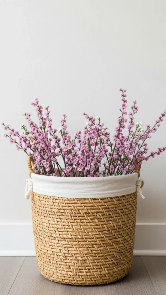 A floor basket is decor that also hides clutter. Use it to hold throws, extra cushions, or small items guests leave around. Choose one basket only so it stays neat.