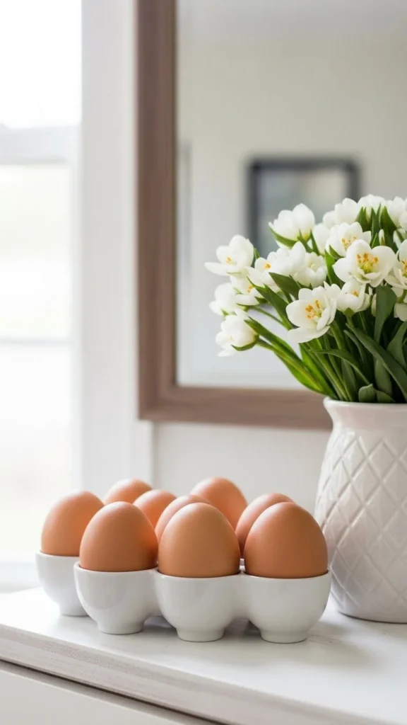 Keep eggs in one bowl on one shelf. Choose soft colors or neutral tones. This keeps the shelf styled without looking crowded.
