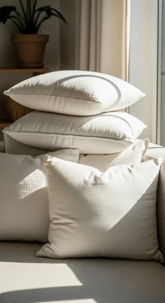 White pillows brighten sofas instantly. Use washable covers so maintenance stays easy. Layer with textured neutrals to avoid a flat look.