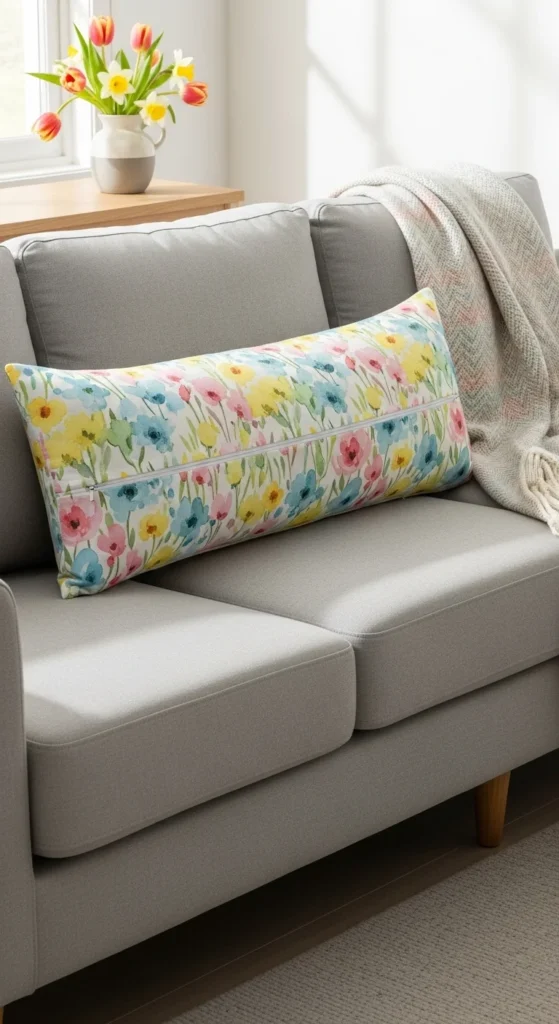 One lumbar pillow can replace several small ones. It keeps the sofa tidy and works well on compact seating. Use light fabric to keep it seasonal.