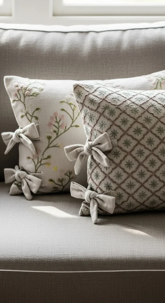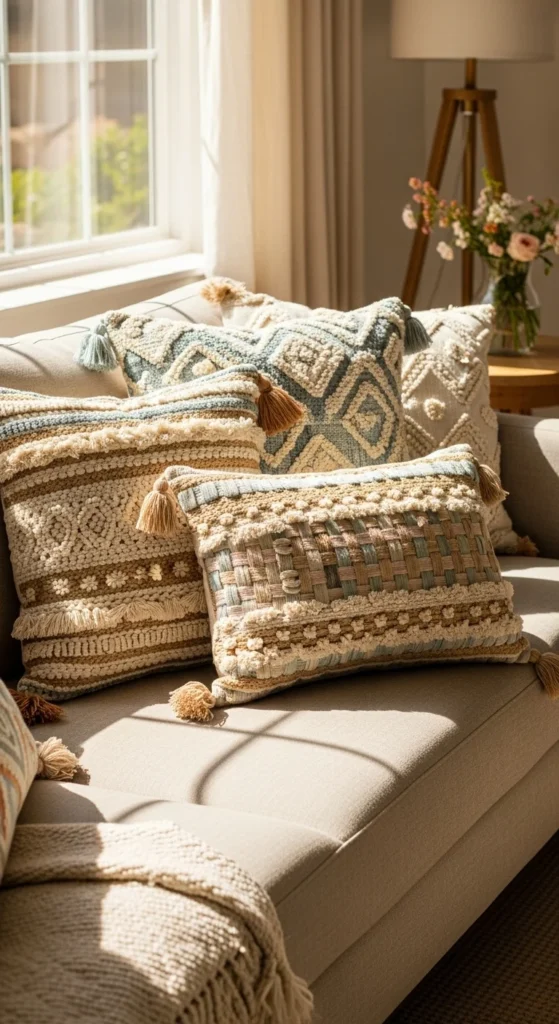 Woven trims or subtle knots add interest. Keep colors calm so texture stands out. DIY idea: stitch simple yarn details onto plain covers.