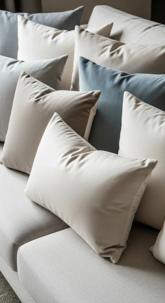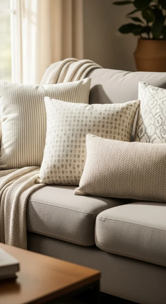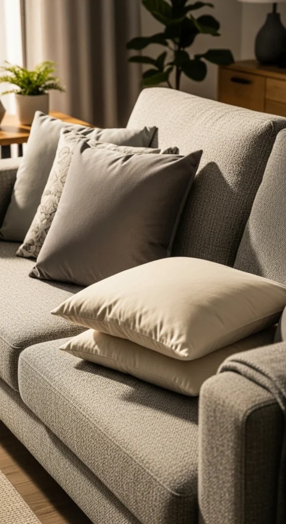 Neutral pillows calm a space quickly. Use cream, sand, and light gray together rather than one flat tone. Mix square and lumbar shapes so the arrangement feels casual. Budget tip: buy covers only and reuse existing inserts. Linen-look or cotton fabrics work well. Keep patterns minimal so the sofa feels open rather than crowded. Rotate pillows seasonally by storing darker covers away.