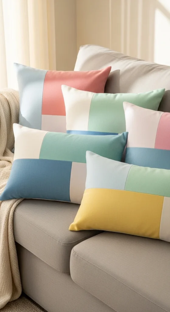 Simple color blocks work when tones are muted. Avoid sharp contrast. This keeps the sofa easy on the eyes.