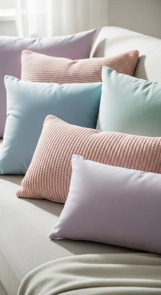 Use pastels sparingly. One or two pillows are enough. Keep shades dusty rather than bright.