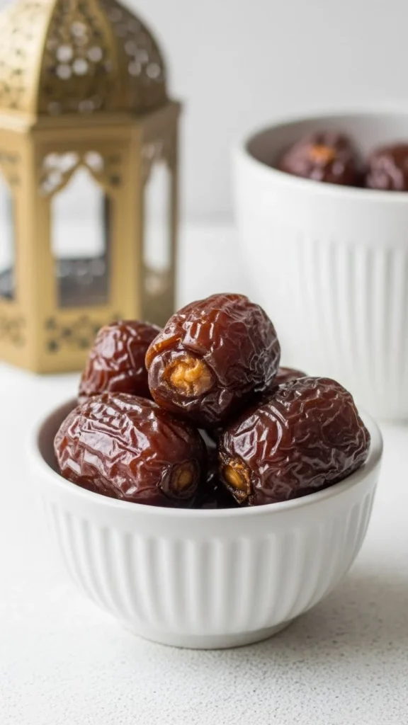 Place dates in small white bowls. Group them on a tray. This looks neat and keeps the iftar area tidy.