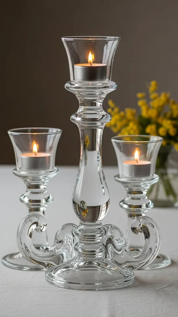 Glass holders with battery candles give gentle light. Group them on a table or shelf.
