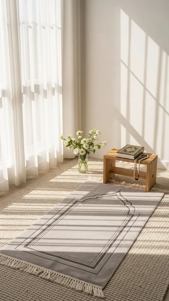 Soft rugs add comfort for prayer and sitting. Choose light colors. If you already have a rug, shake it out and clean it. Even that small step makes the room feel new. Place rugs where people gather most.