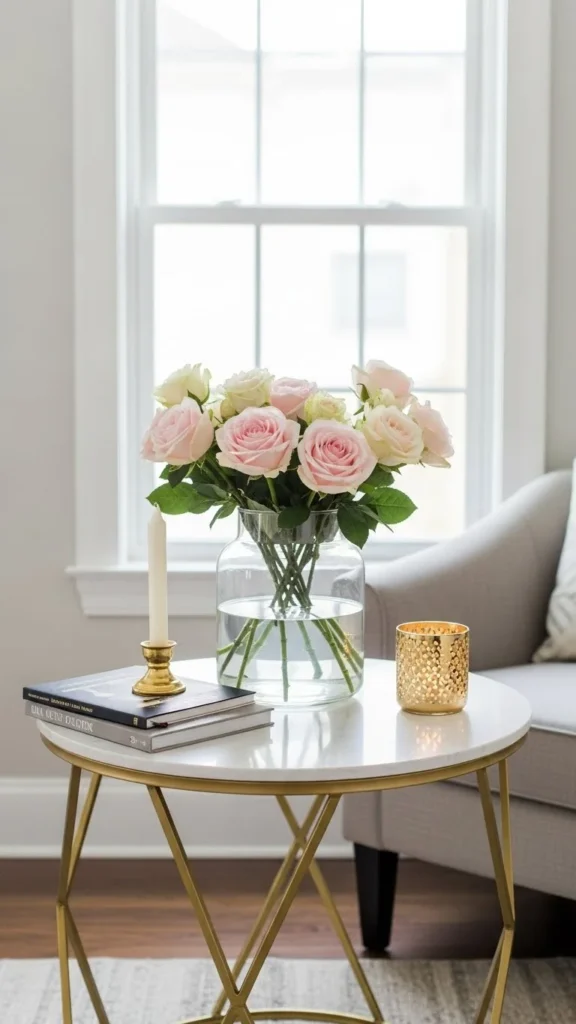 White flowers look clean and calm. Use tulips, daisies, or roses. Place them in clear glass vases. Spread one bunch across several jars to save money. Set them on tables or windowsills. They add life to the space without being loud. Faux flowers also work if you prefer something that lasts longer.