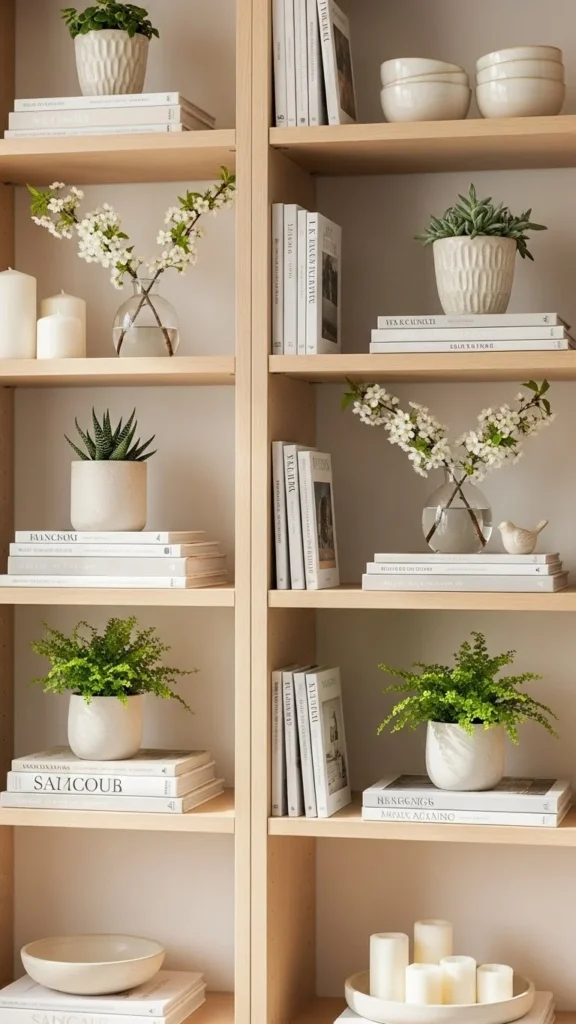 Open shelves look better when they are not crowded. Remove some items and keep only a few pieces. Use light colored decor and small plants. This makes the shelves feel calm and tidy. You do not need new items. Just rearranging what you have can change the look.