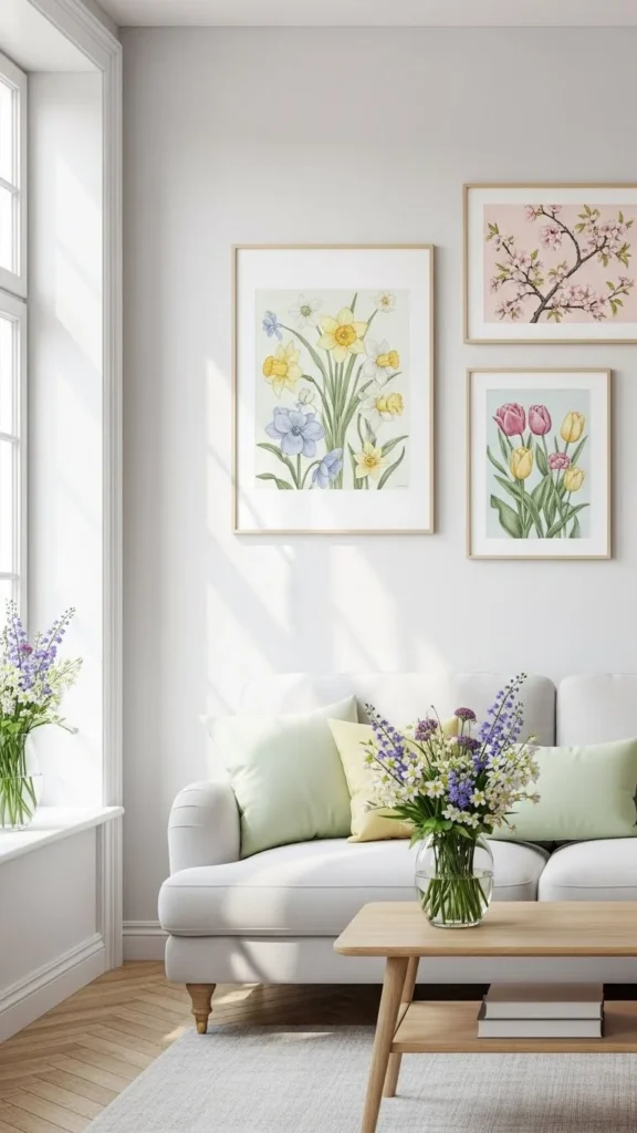 Floral prints bring in a spring feel. You can print designs at home or find low cost prints online. Use thin frames for a light look. Hang two or three together for a small gallery wall.