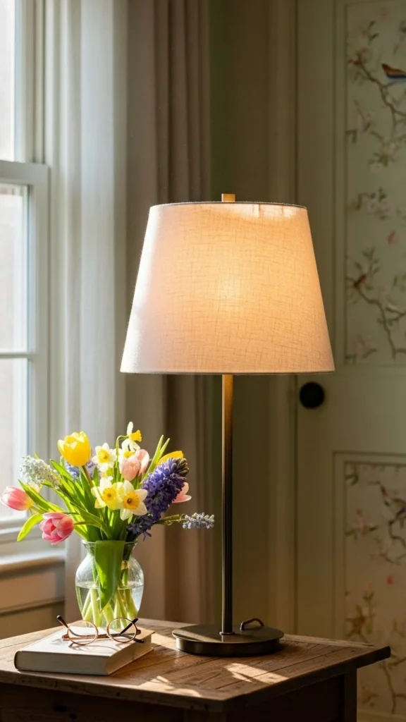 Light shades soften lamp light. If your shade is dark, replace it or cover it with fabric. This simple DIY makes the room feel warmer at night and brighter during the day.