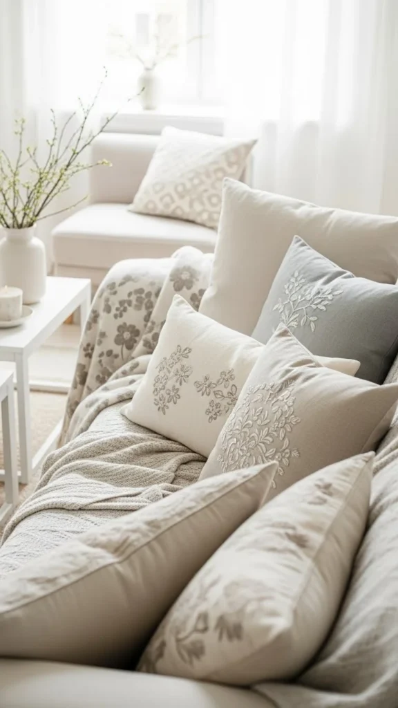Neutral pillows balance patterned ones. Use shades like cream or light gray. Mixing them keeps the look calm.