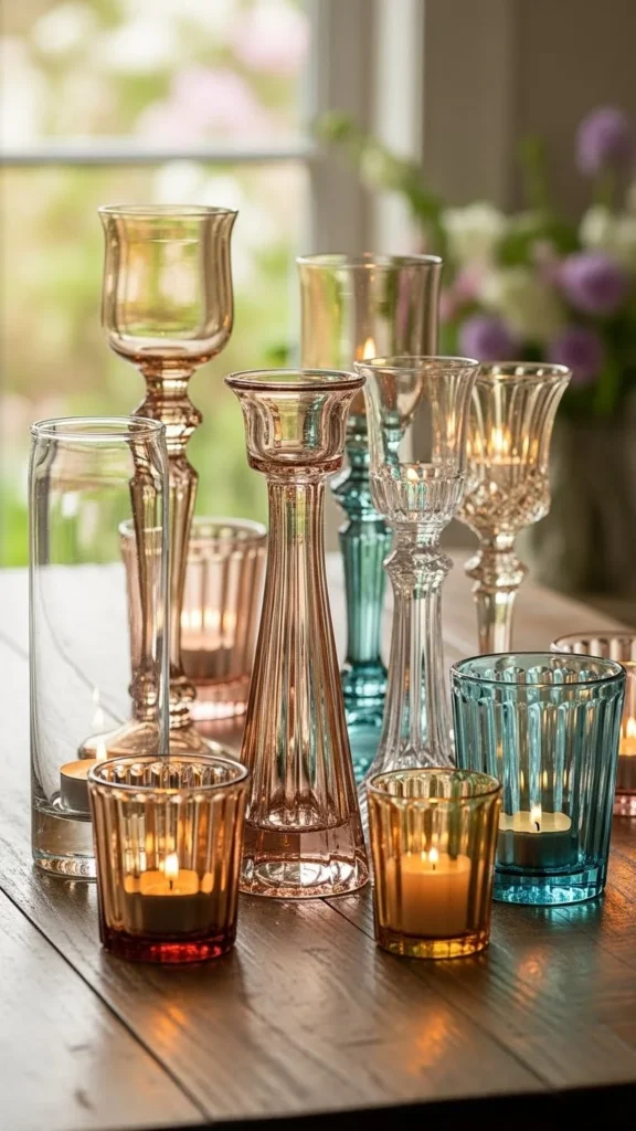 Glass holders catch light and add a soft shine. Use what you have or find simple ones at low cost. Group them on a tray.