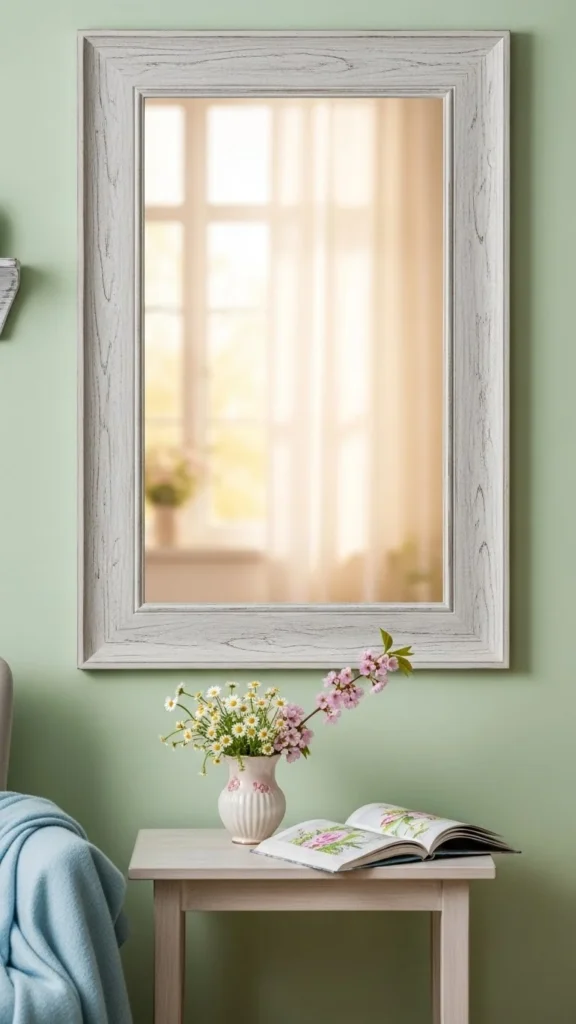 Mirrors reflect light and make rooms feel open. A pale frame keeps the look gentle and calm.