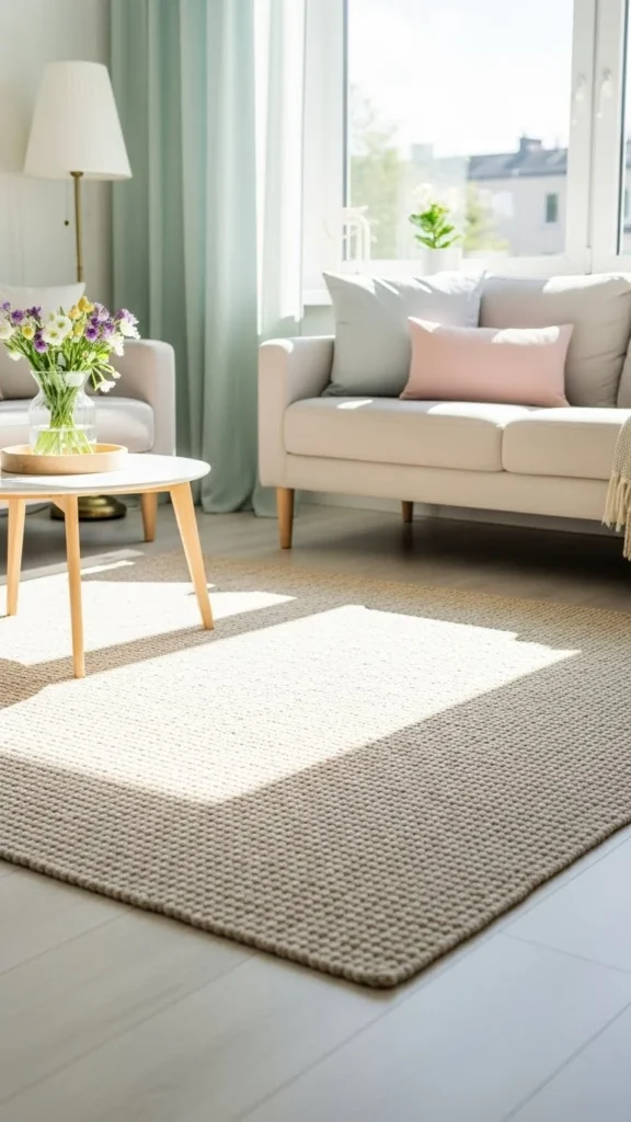 A pale rug can make a room feel brighter. Dark rugs often make spaces feel smaller. Switching to a light tone helps the floor reflect light. You do not need a large or costly rug. A smaller one under a coffee table or beside the sofa is enough. Look for cotton or flat woven styles that are easy to clean. If you already own a light rug, try moving it to a new spot. This simple shift changes the room without spending anything. Rugs also help soften hard floors and make a space feel more comfortable to walk on.