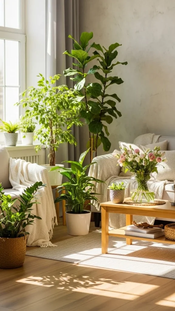 Plants bring life into a home. Even one or two small pots make a difference. Choose easy care plants like snake plants or pothos. These do well indoors and are low cost. Place them near windows or on shelves. If you prefer, good quality faux plants also work. The green color adds a natural feel that suits spring and summer.