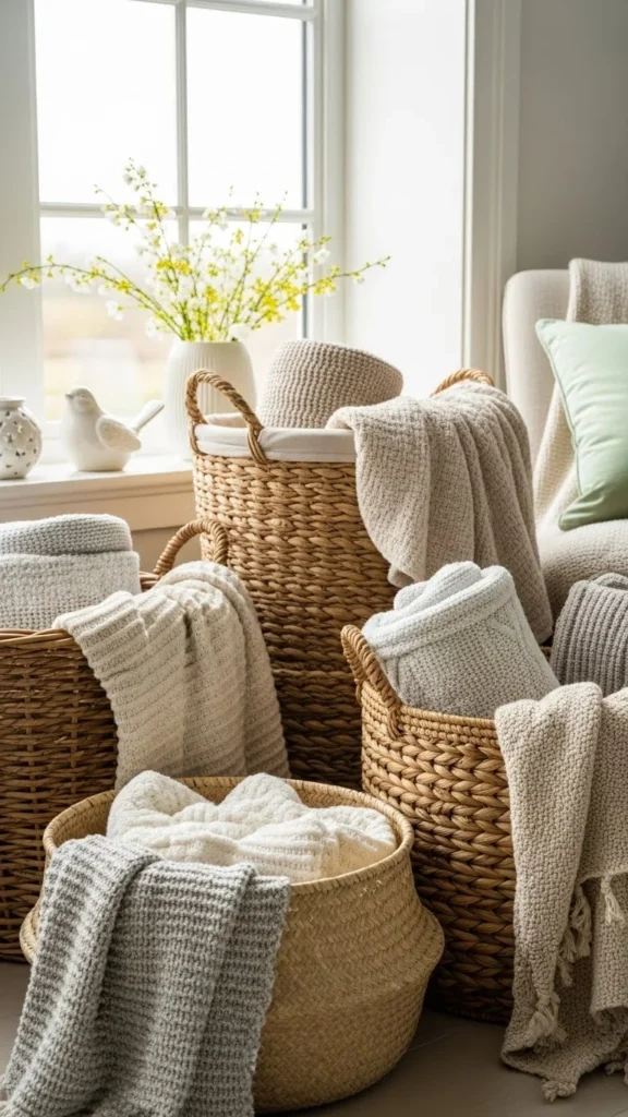 Wicker baskets store items while adding warmth. Place them where clutter builds.
