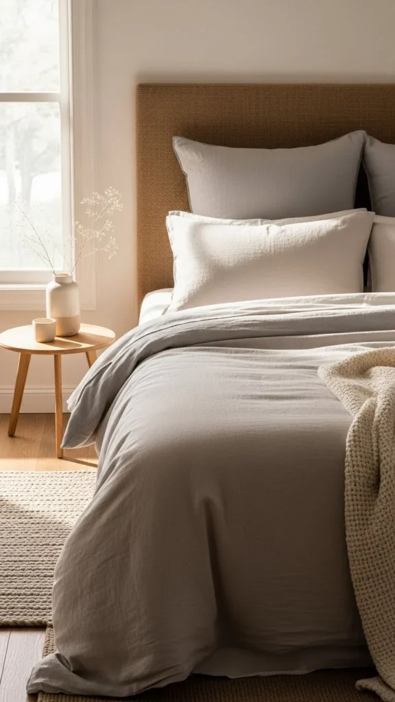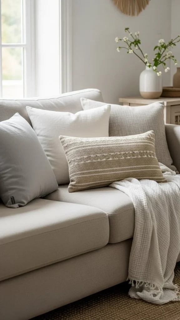 Natural fiber pillow covers feel breathable and timeless. Stick to solids or soft patterns.