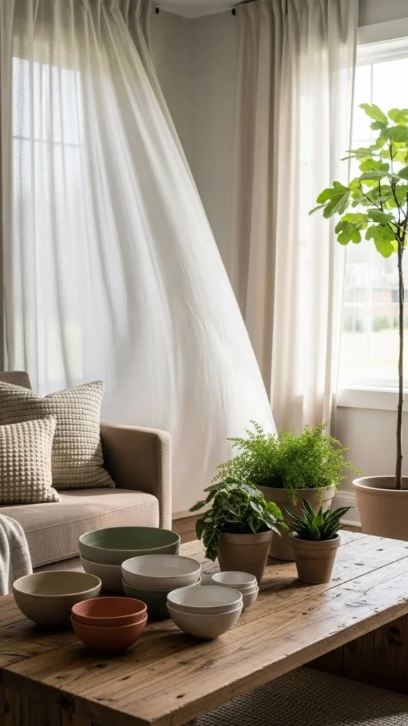 Choose neutral or undyed fabric. Hang panels slightly higher than the window frame for balance. Let them fall naturally without ties.
