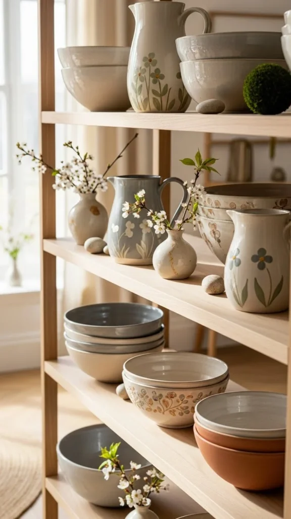 Handmade ceramics add texture and subtle variation. Bowls, cups, and pitchers work as decor and daily-use items.