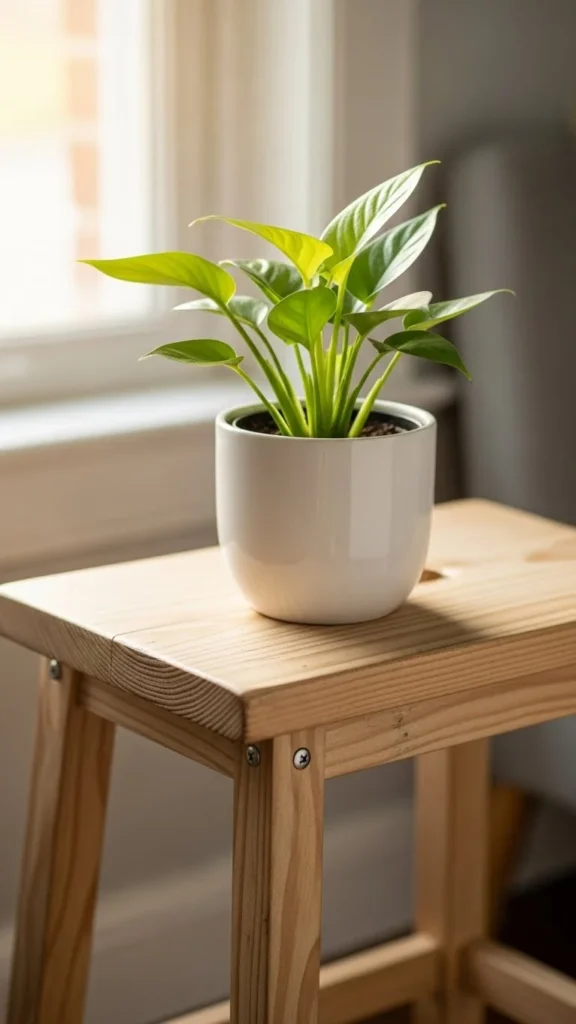Wooden stools replace bulky tables easily. Look for solid construction and simple shapes.