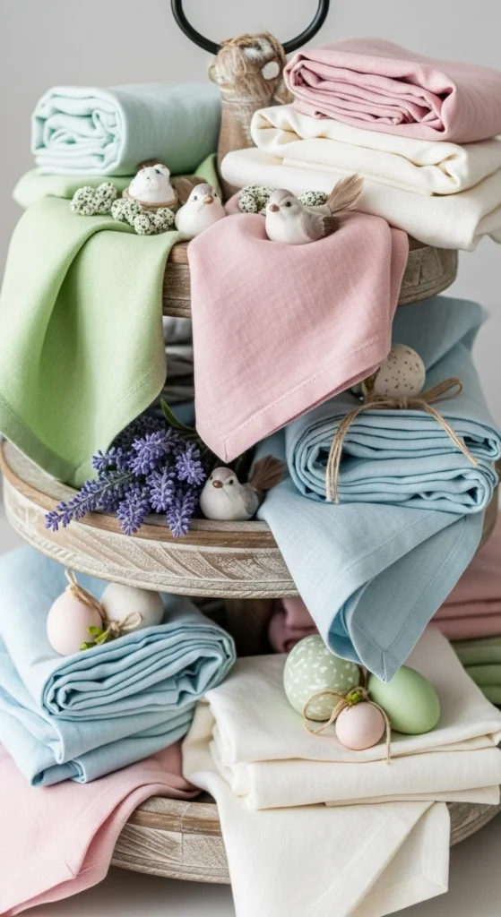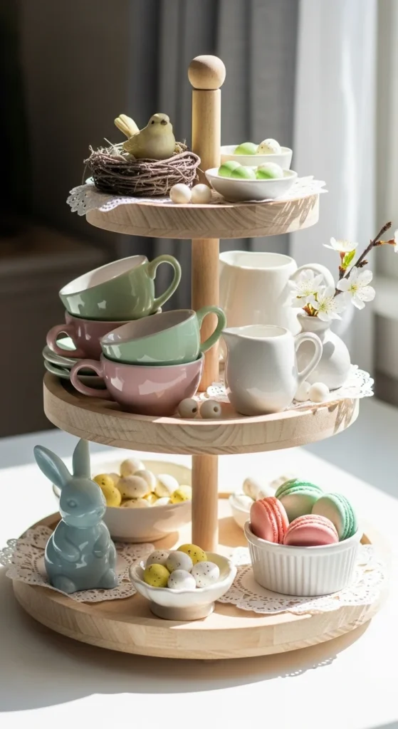 Soft pastel ceramics instantly signal spring without overpowering the tray. Think pale pinks, light blues, or gentle yellows paired with white or wood bases. This keeps the colors calm and balanced.