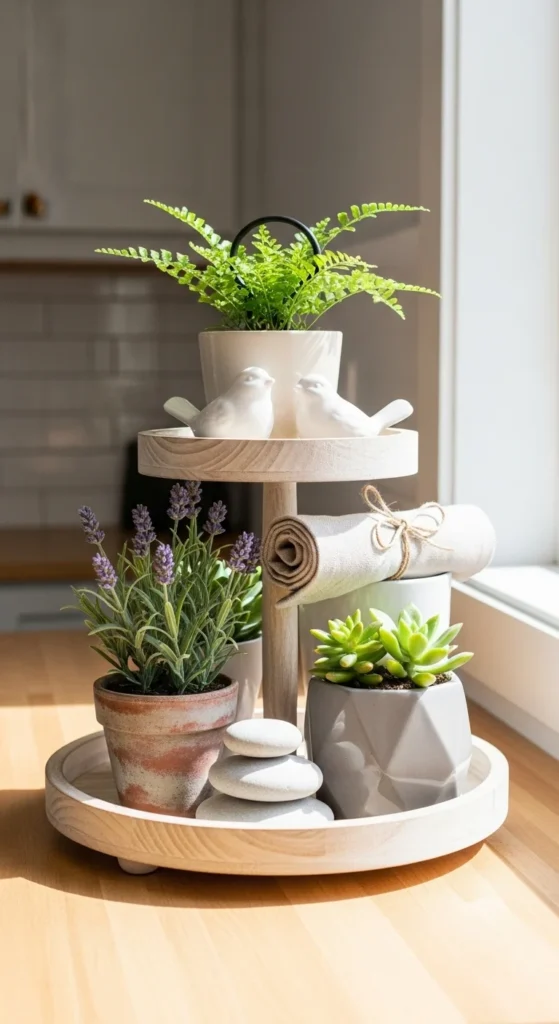Small plants add life to a tiered tray without much effort. Faux greenery works just as well and lasts all season. Choose compact pots so they don’t crowd the tray.
