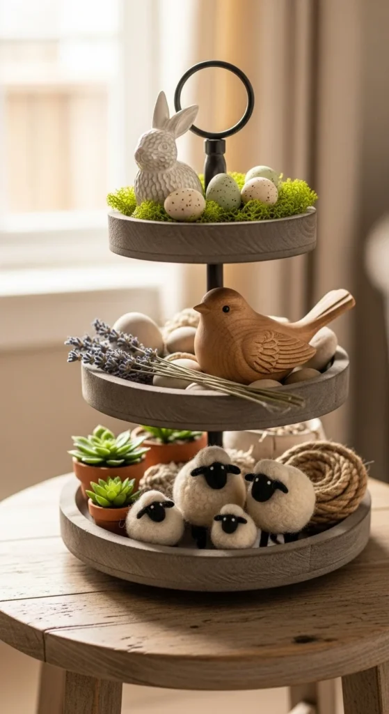 Small animal figures bring charm without feeling seasonal overload. Choose neutral colors instead of bright paint.