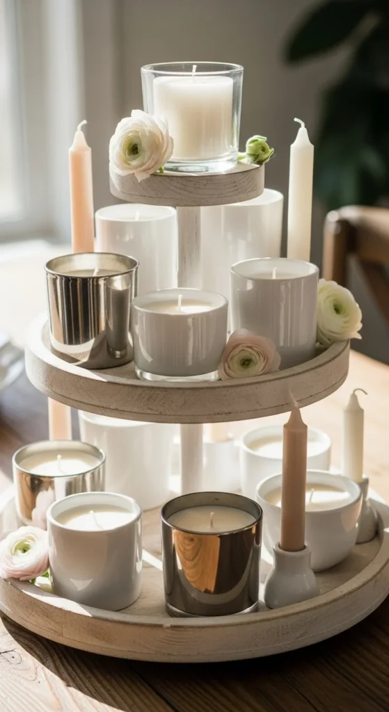 Short candles add warmth and balance. Stick to white, cream, or soft beige.