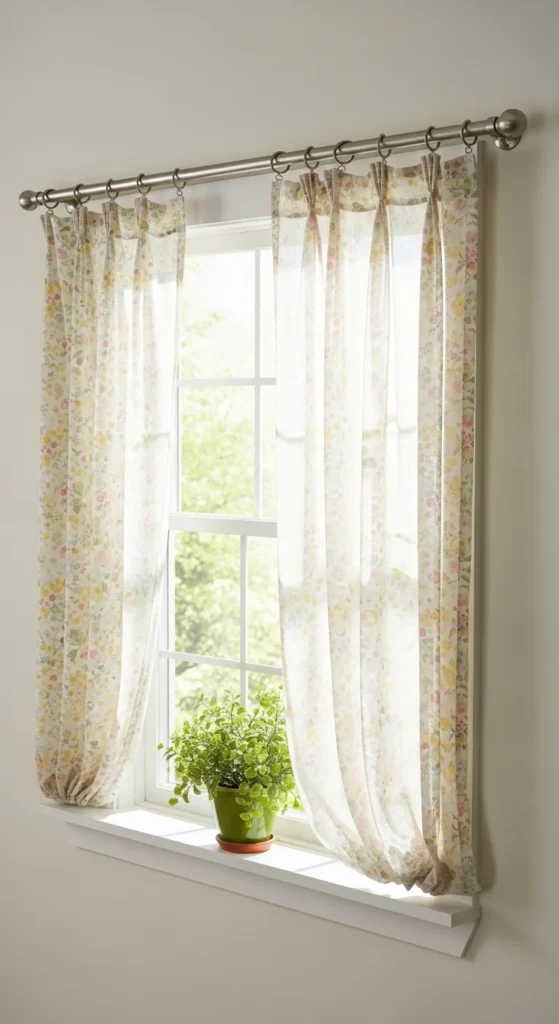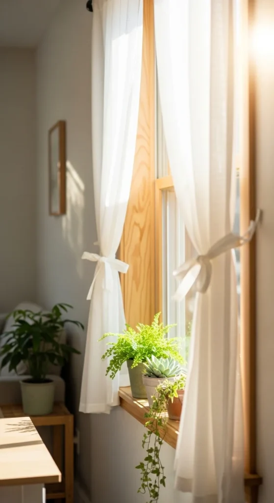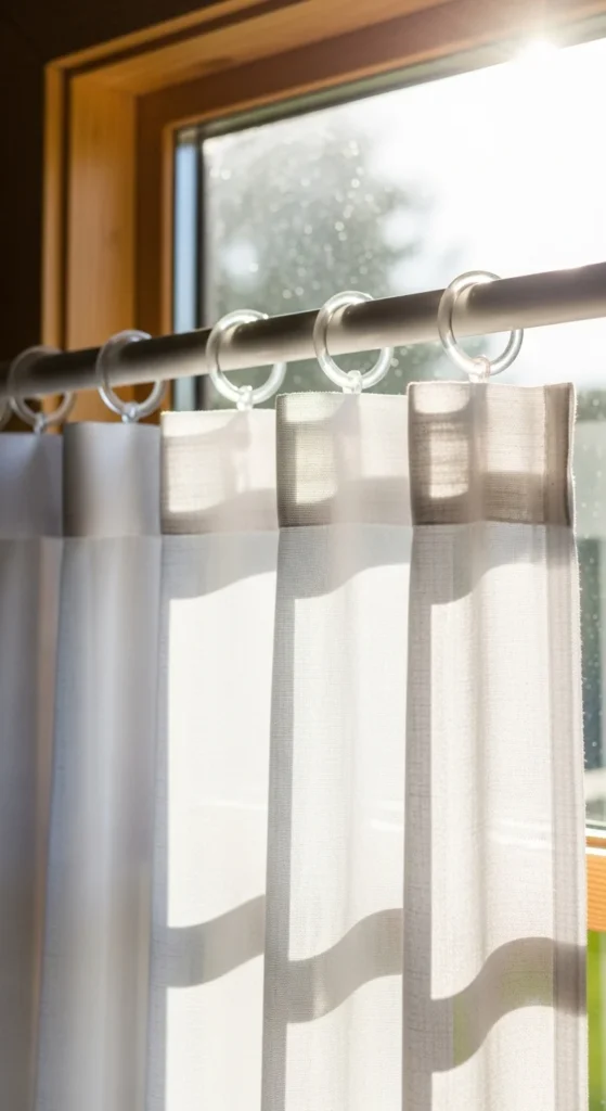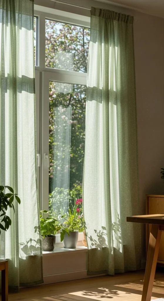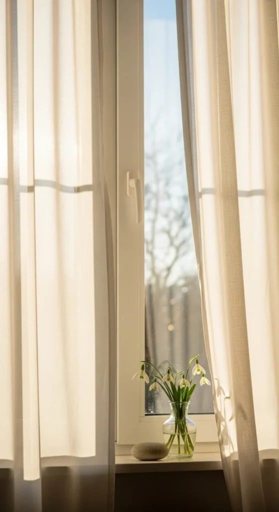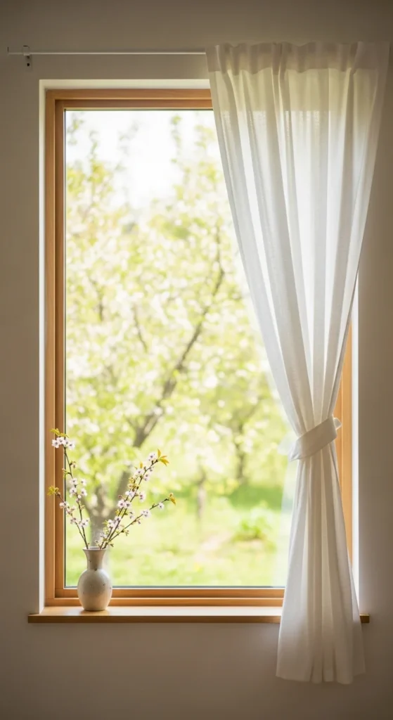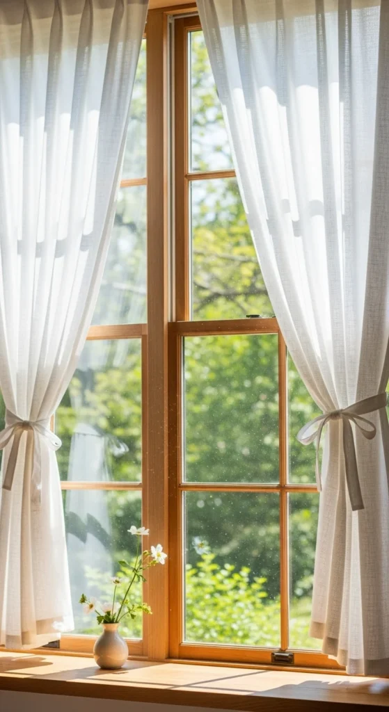 Sheer panels are a simple switch that changes everything. They soften harsh light without darkening the room. Hang them high and wide so the window looks taller. Keep the fabric plain with no heavy stitching. Budget tip: use voile curtains from discount stores or even lightweight cotton sheets cut to size. Clip rings work well and avoid sewing. Keep the sill clear so light reaches deeper into the room. This setup works in living rooms, bedrooms, and kitchens.