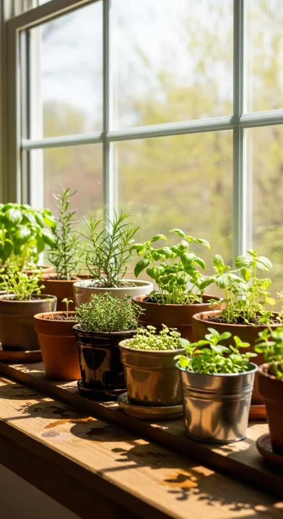 Place herbs near the window rather than directly on the sill. This keeps the glass clear. Use matching pots for a tidy look. Grow from cuttings to save money. This works well in kitchens where light is strong.