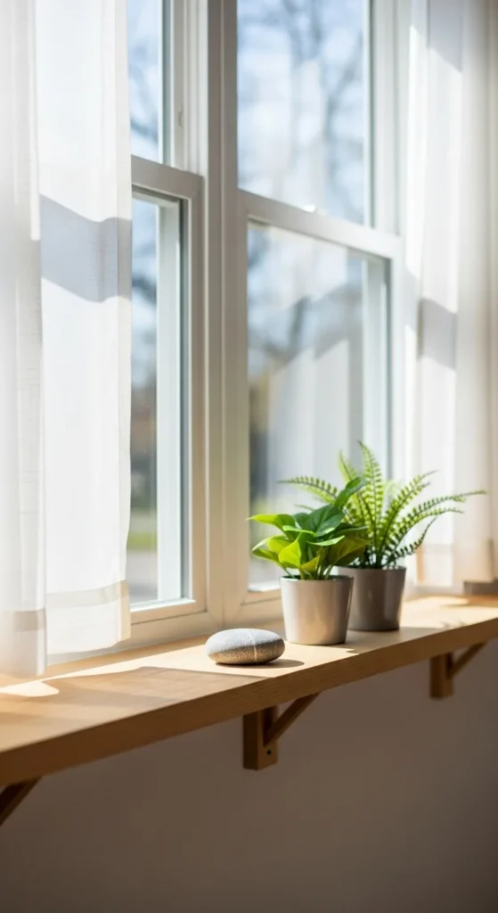 Keep the sill almost empty. One small object is enough. A tiny plant or ceramic bowl works well. Avoid rows of items that block light. If your sill is deep, place decor to the side rather than centered. This keeps the window feeling open.