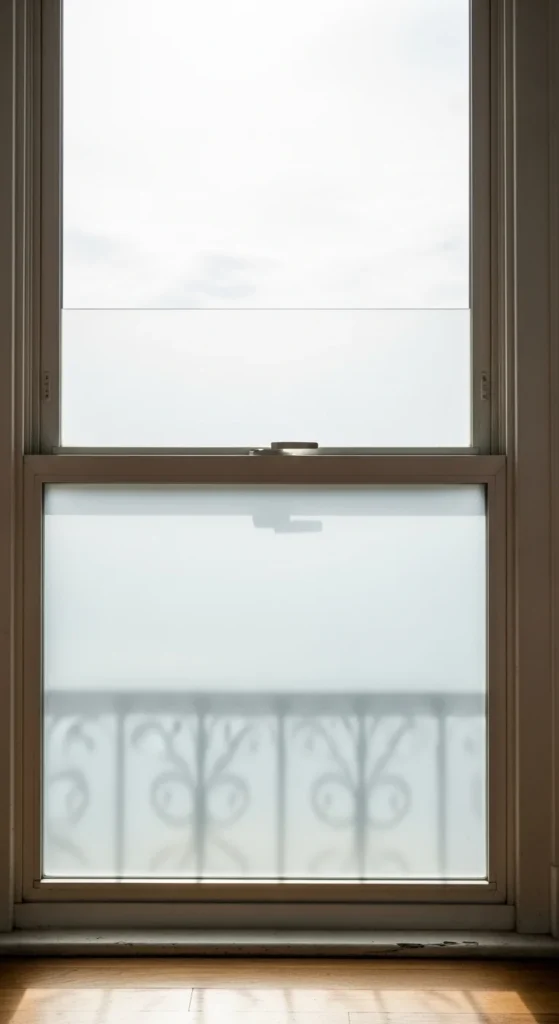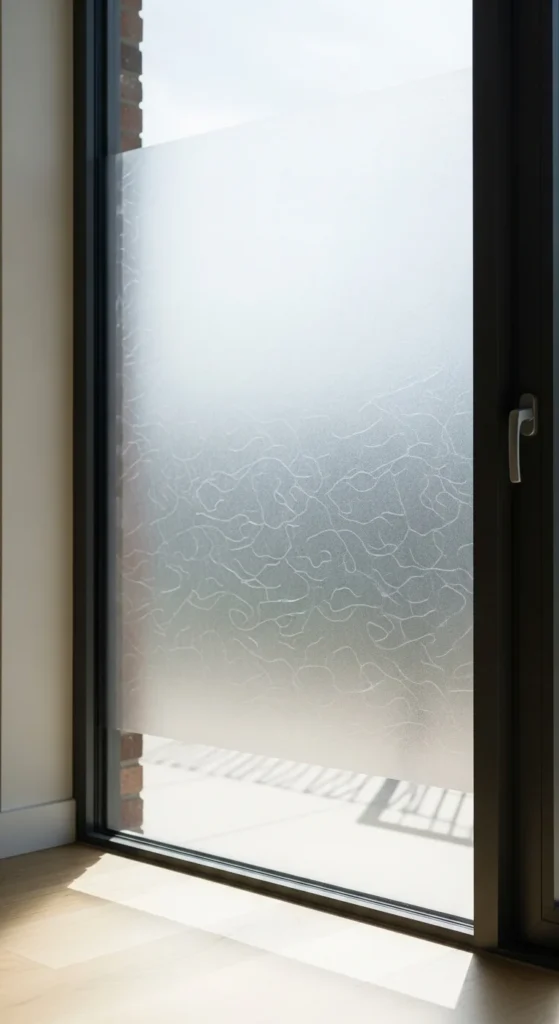 Frosted film adds privacy while still letting light pass. Apply it only to the lower half. It peels off easily and works well in rentals. Choose plain styles without patterns to keep things simple.