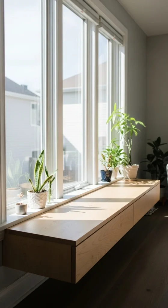 Install a narrow shelf above or beside the window. Use it for one or two objects only. Keep the center clear. This adds interest without blocking daylight. Floating shelves are easy to remove later.
