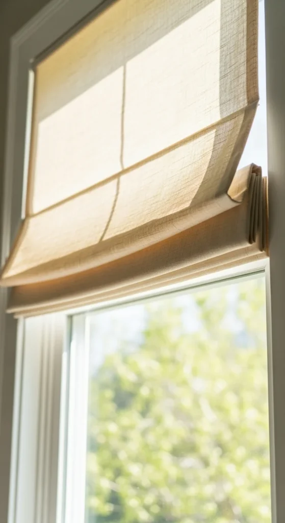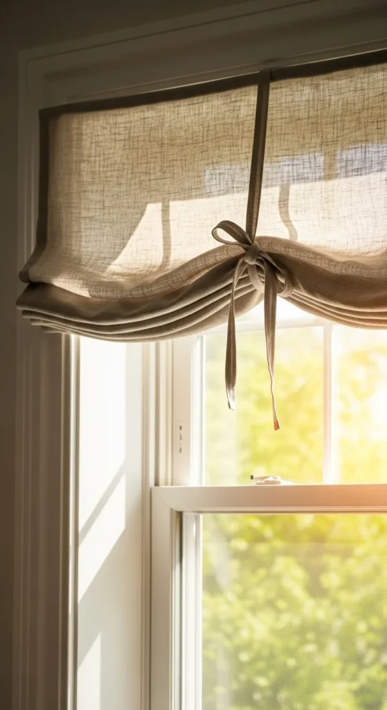 Linen shades rolled and tied feel casual. Use fabric ties rather than cords. This keeps the window open during the day and adds texture.