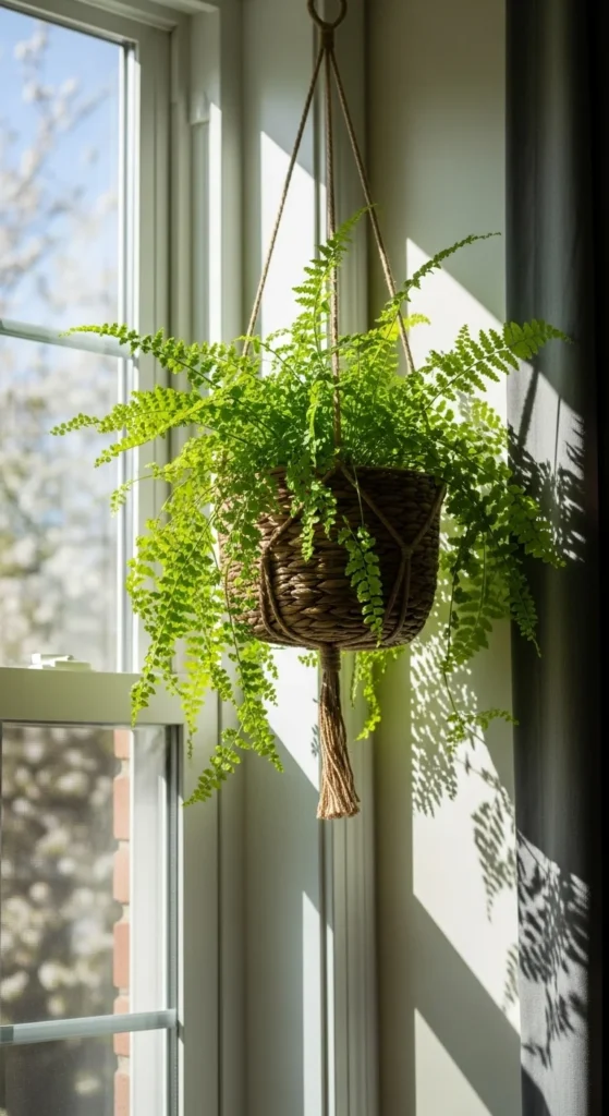 Hang plants to the side of the window instead of in front. This keeps glass clear while adding life. Use simple hooks and lightweight planters. Cuttings root well in water jars for a low-cost option.