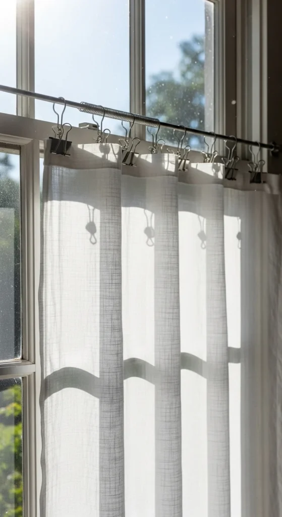 Use clip rings or adhesive hooks instead of drilling. This is renter-friendly and easy to adjust. Choose light fabric so the window stays bright.