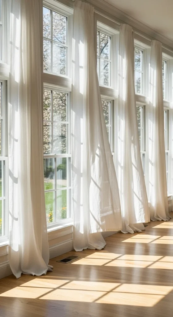 Using the same curtains across a room creates flow. Light fabrics help all windows work together. This makes the space feel open and calm.