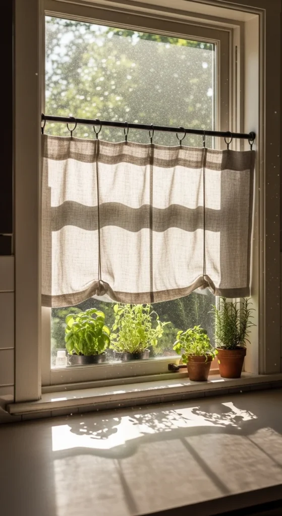 Cafe curtains give privacy while keeping the top half open. Choose linen or cotton in pale tones. Mount the rod halfway up the window. This keeps sunlight flowing while still feeling cozy. You can make cafe curtains from table runners or old fabric panels. Iron well so folds hang straight. This idea works well in kitchens and bathrooms.
