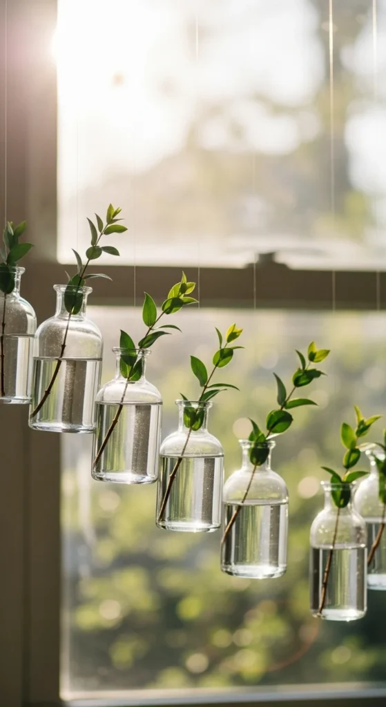 Glass vases catch light without stopping it. Hang them with clear fishing line or thin twine. Use just one or two. Add a single stem to each. Budget option: reuse spice jars or small bottles. Keep spacing wide so the window still feels open.