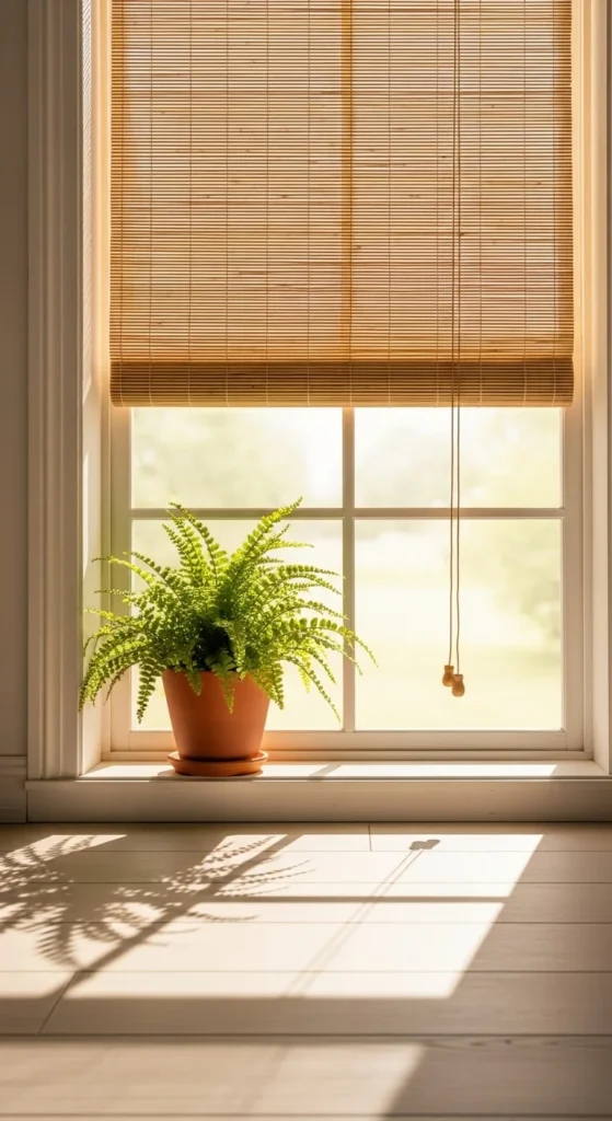 Bamboo shades filter light softly. Choose light-toned versions and keep them raised during the day. They add texture without darkening the room. Look for secondhand shades and trim to fit. Pair with sheer curtains if privacy is needed at night.