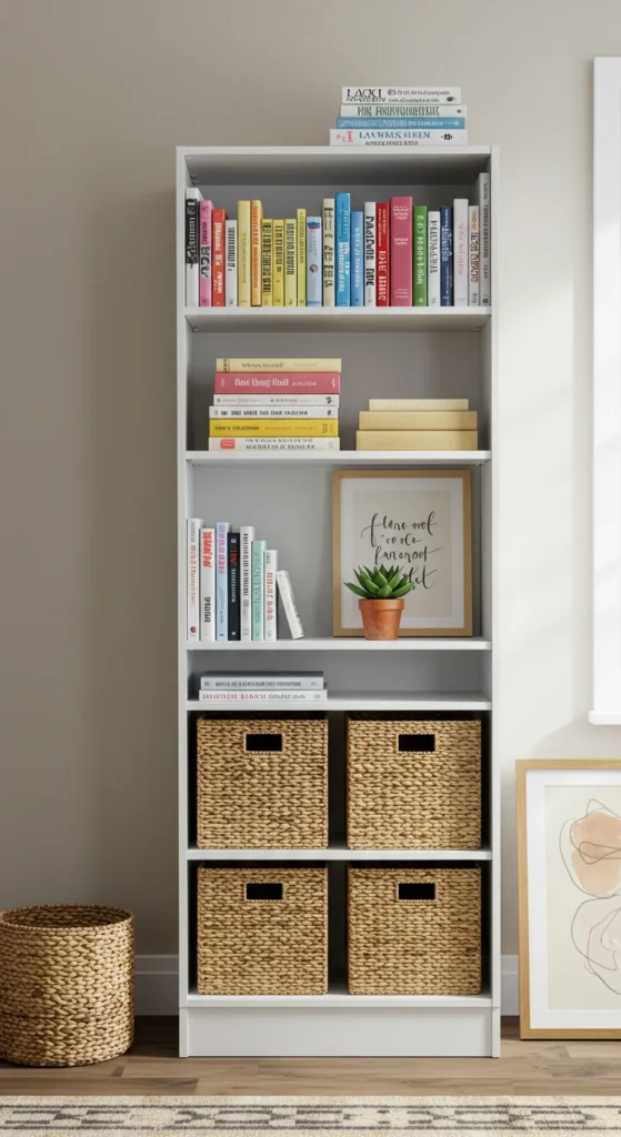 - Dedicate the lower shelves to baskets or bins for hidden storage of less-attractive items.
