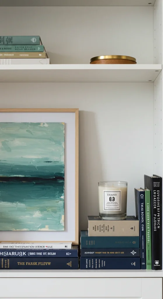 Mixing decor with books makes the shelf feel intentional, not cluttered.