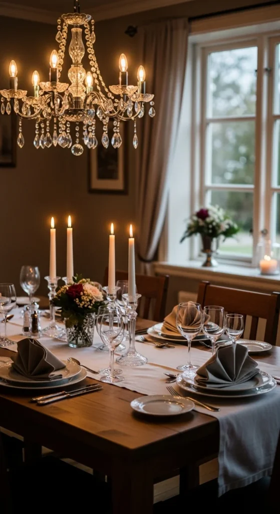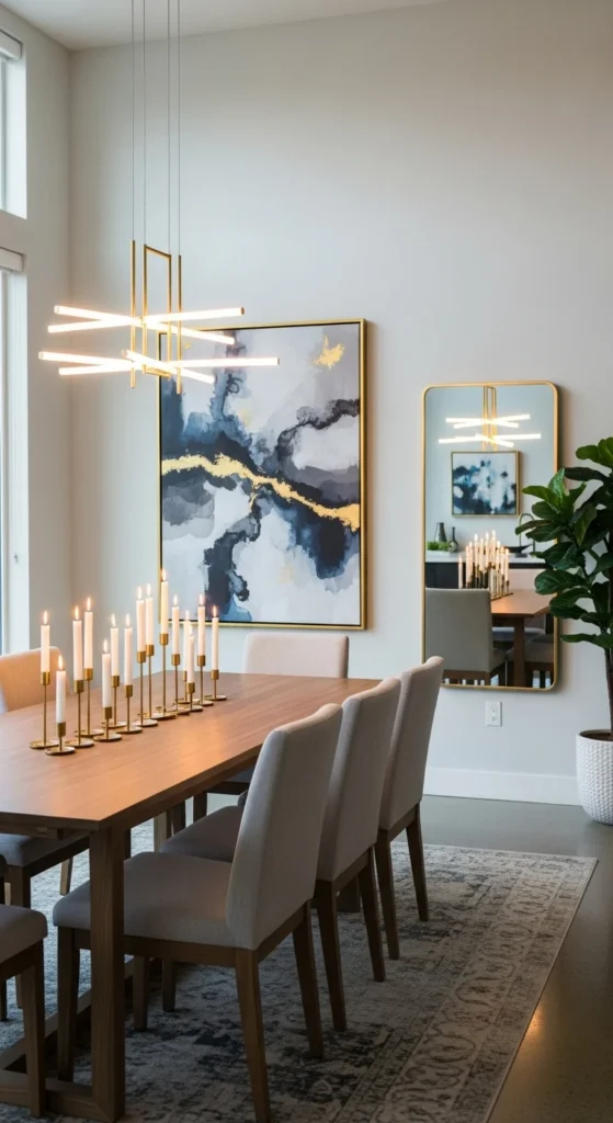 - Install a statement chandelier or pendant centered over the table.