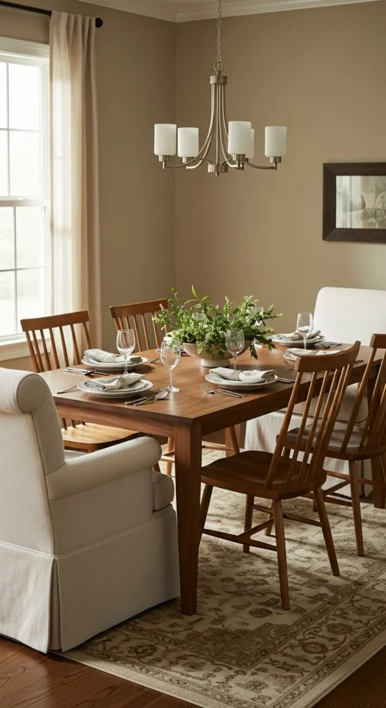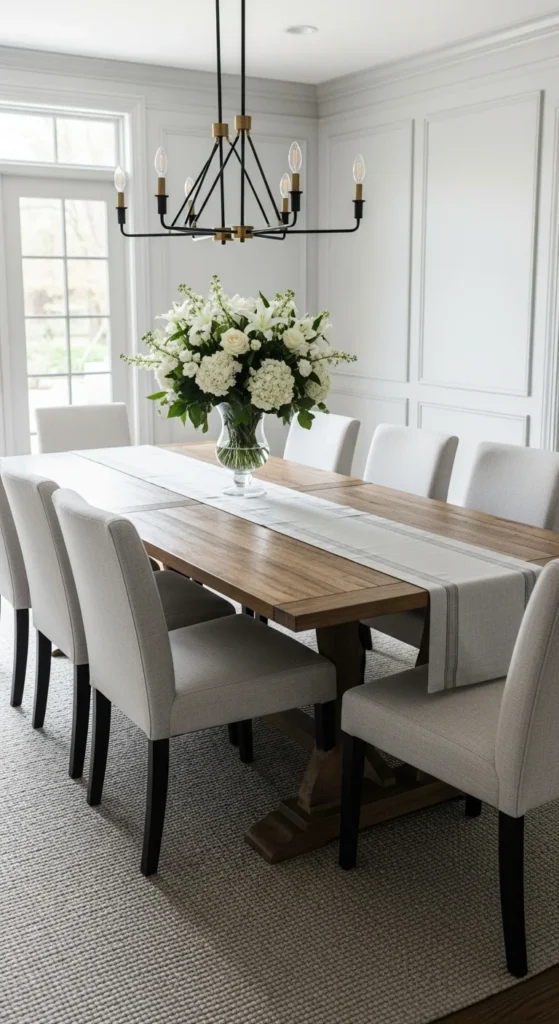 - Mix two different chair styles (like upholstered ends and wooden sides) for designer flair.