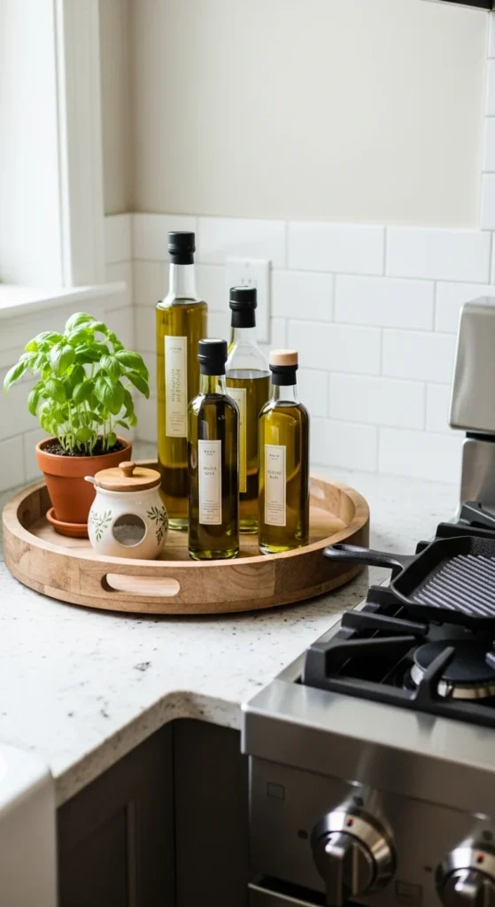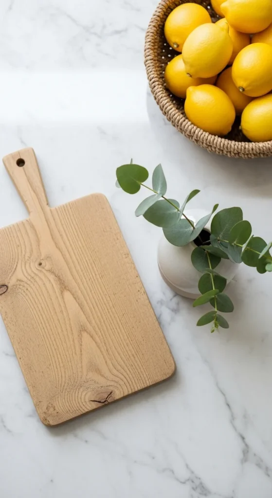 - Corral loose items on a small tray or wooden cutting board for a tidy look.