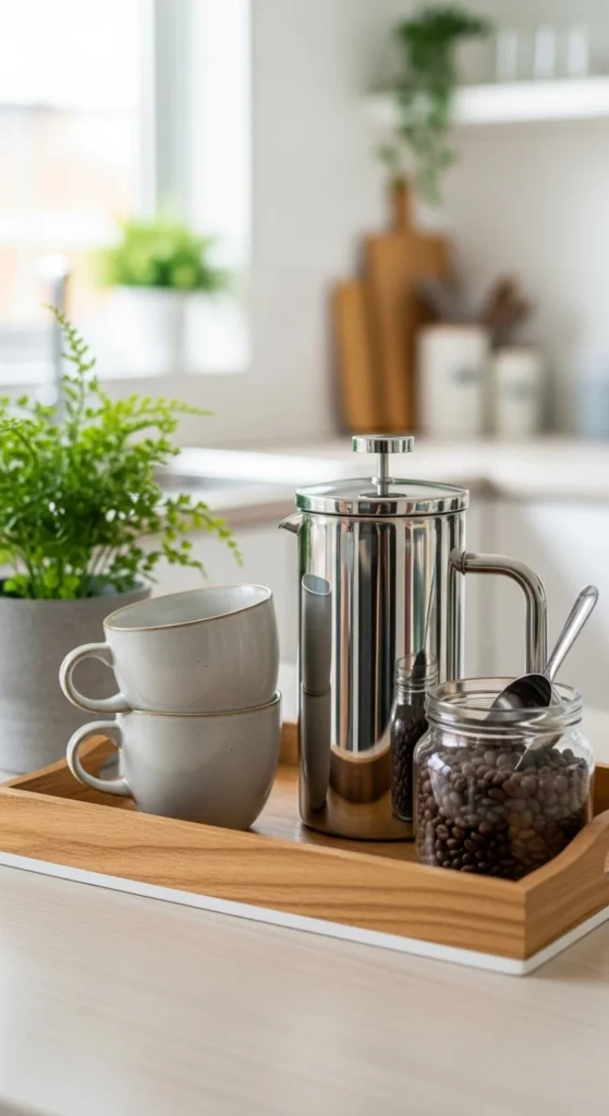 - A coffee corner with a tray holding mugs, a canister, and a small spoon jar.