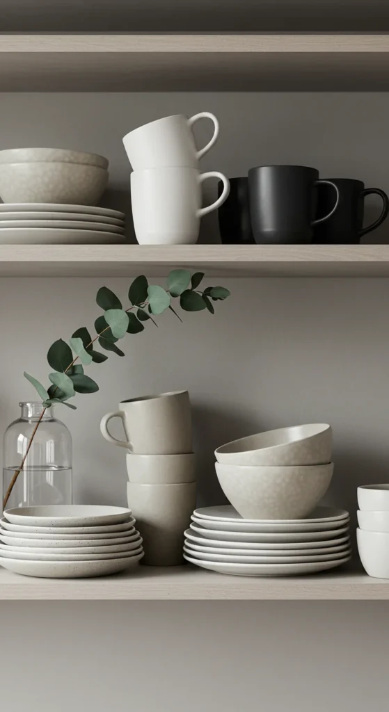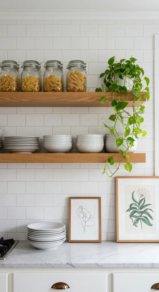 Open shelves offer the perfect opportunity to show off your style while staying organized. By choosing a consistent color palette, varying heights, adding greenery, and grouping thoughtfully, you can keep your shelves both functional and beautiful.