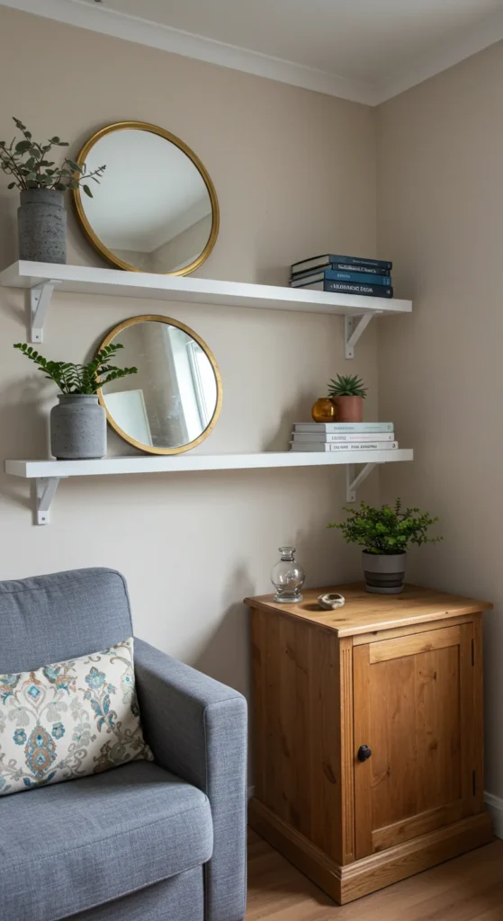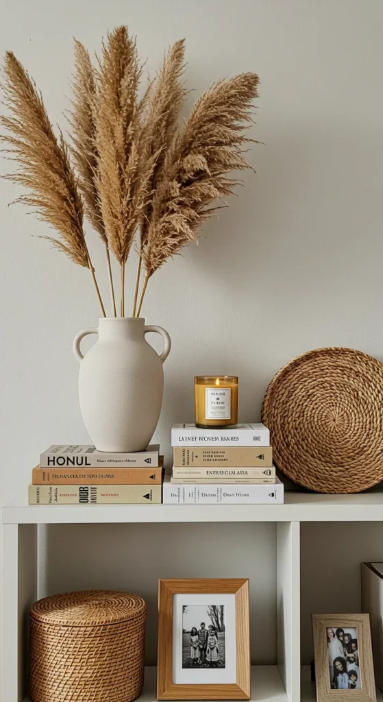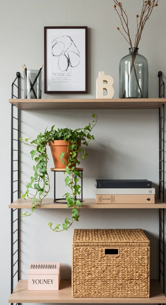 • Cluster similar pieces—like a candle, a framed print, and a small plant—together on one shelf.
